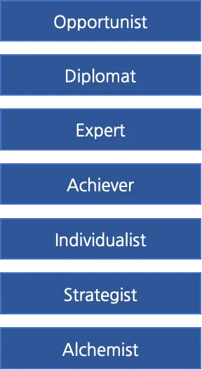 The results enabled the researchers to create seven layers of action logics: Opportunist, Diplomat, Expert, Achiever, Individualist, Strategist, and Alchemist. Action logics are how leaders interpret their surroundings and react when their power or safety is challenged.